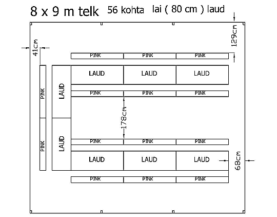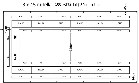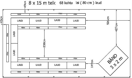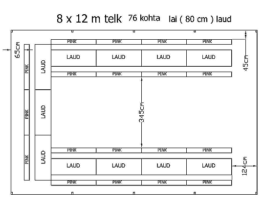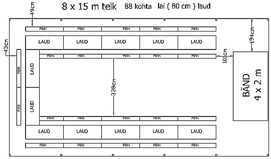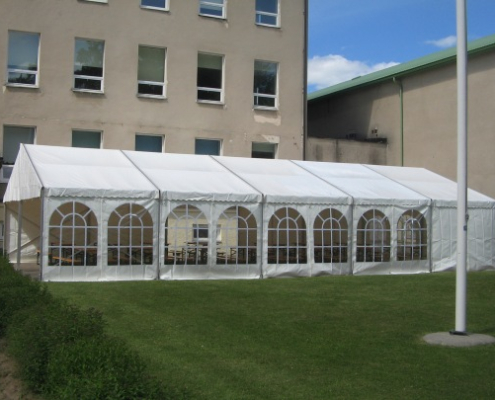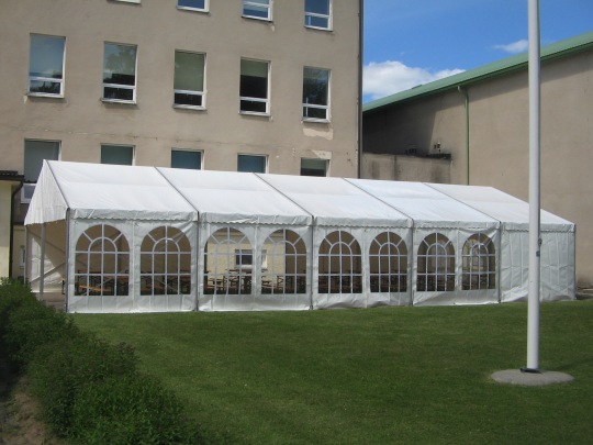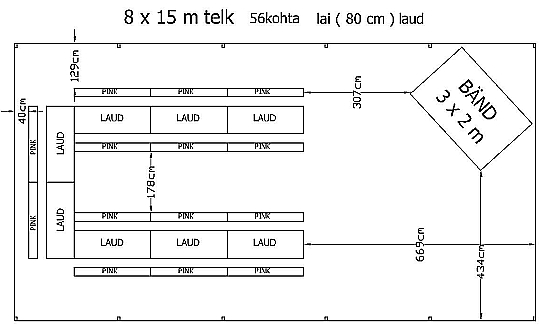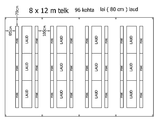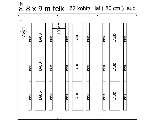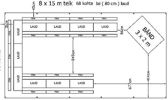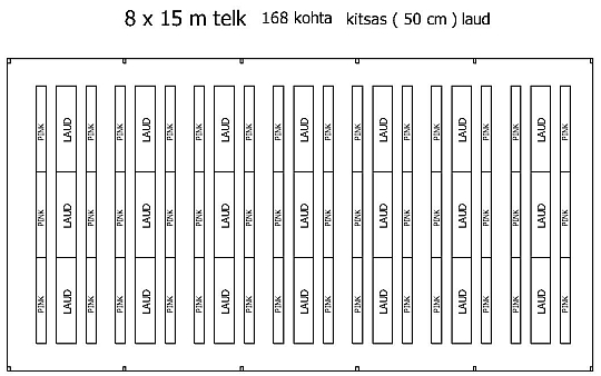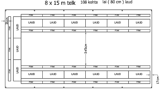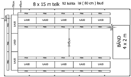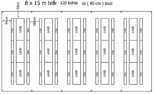 Alumiiniumkarkassil telk, serva kõrgus 2,3 m, harja kõrgus 3,74 m, pikkus 15 m (sammuga 3 m), katuse kaldenurk 20 kraadi. 50% küljeseinakilesid akendega.