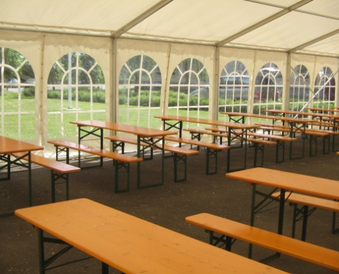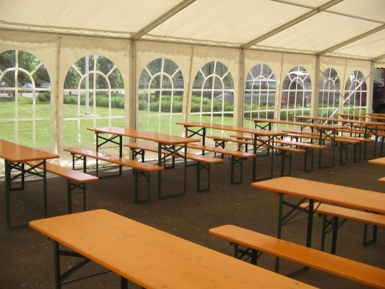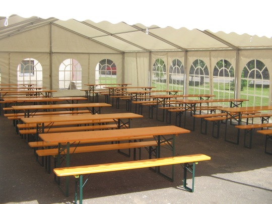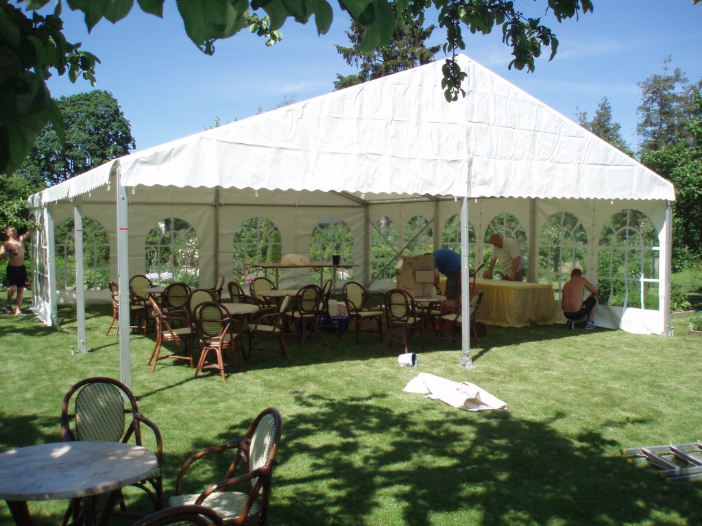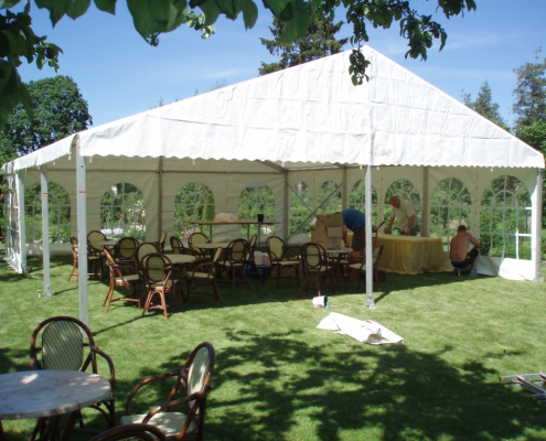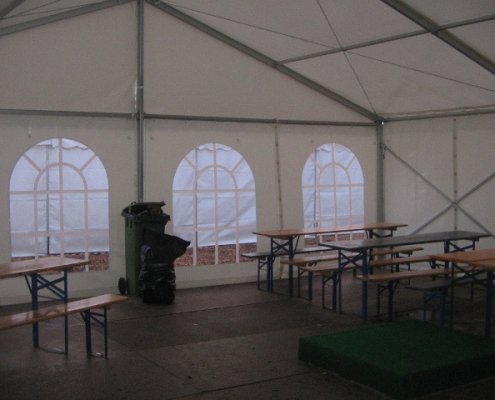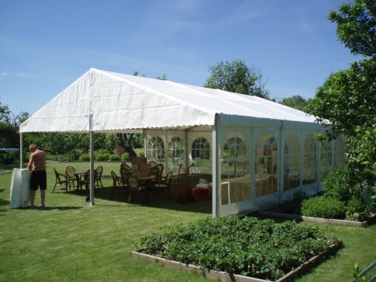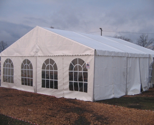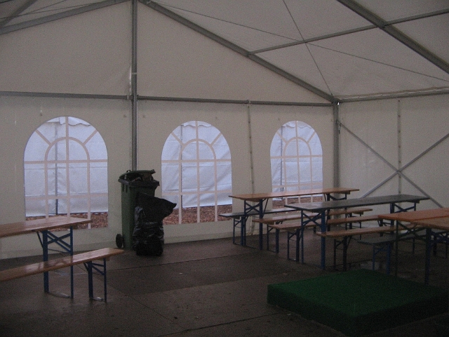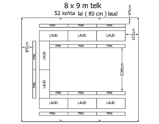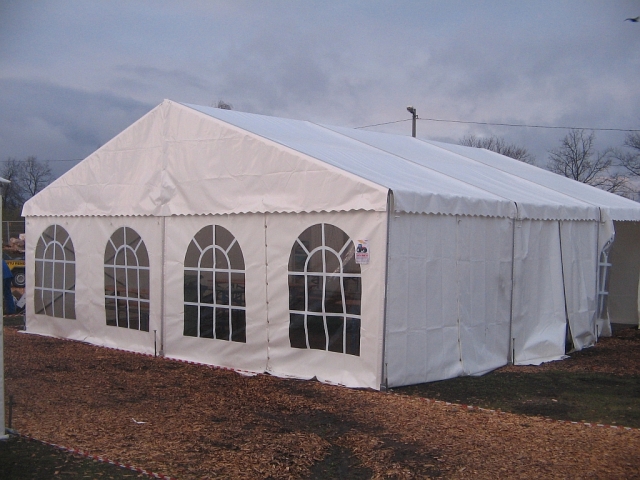Alumiiniumkarkassil telk, serva kõrgus 2,3 m, harja kõrgus 3,74 m, pikkus 15 m (sammuga 3 m), katuse kaldenurk 20 kraadi. 50% küljeseinakilesid akendega.